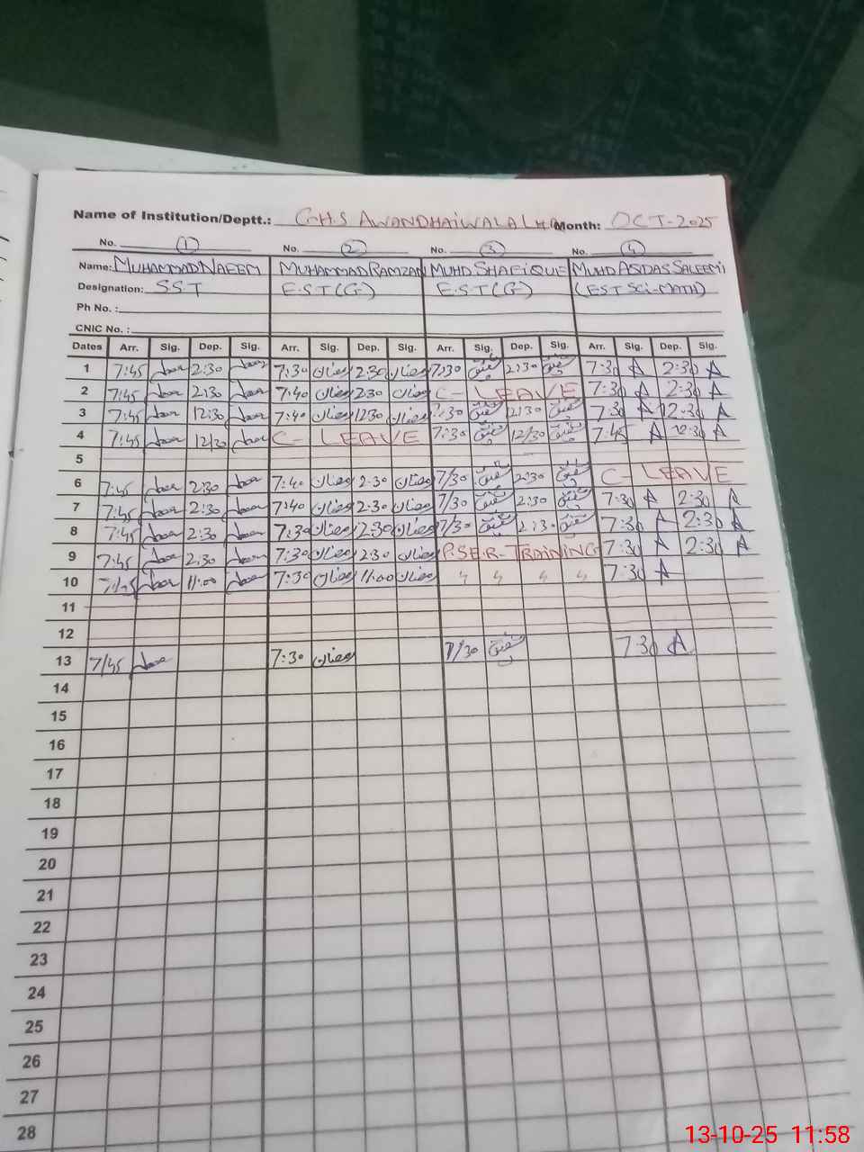 | CNIC | Full Name | Designation | R/C | Absence during last cal. month |