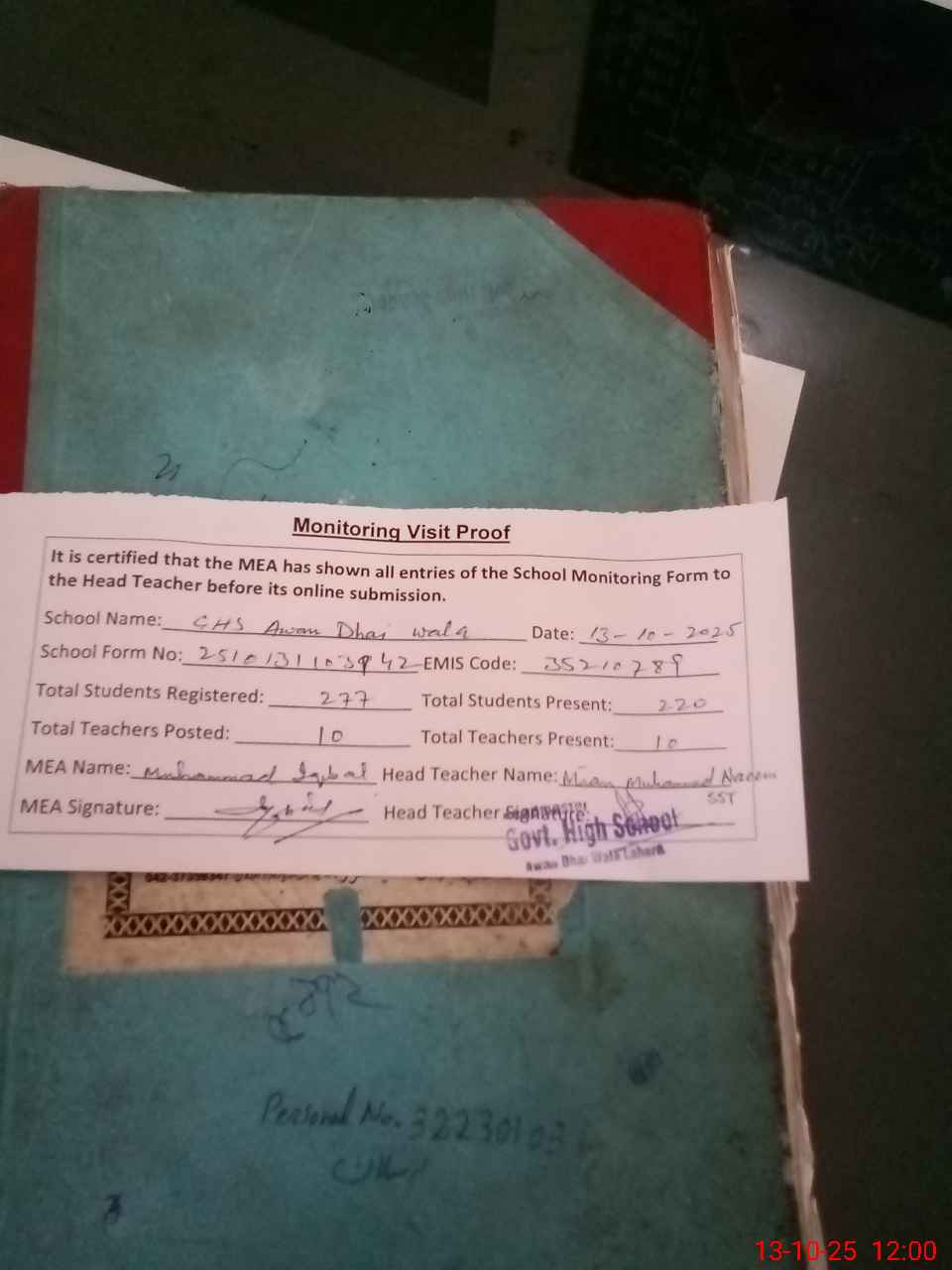 | Attendance Register | Head Teacher | MEA with School | Visit Proof |