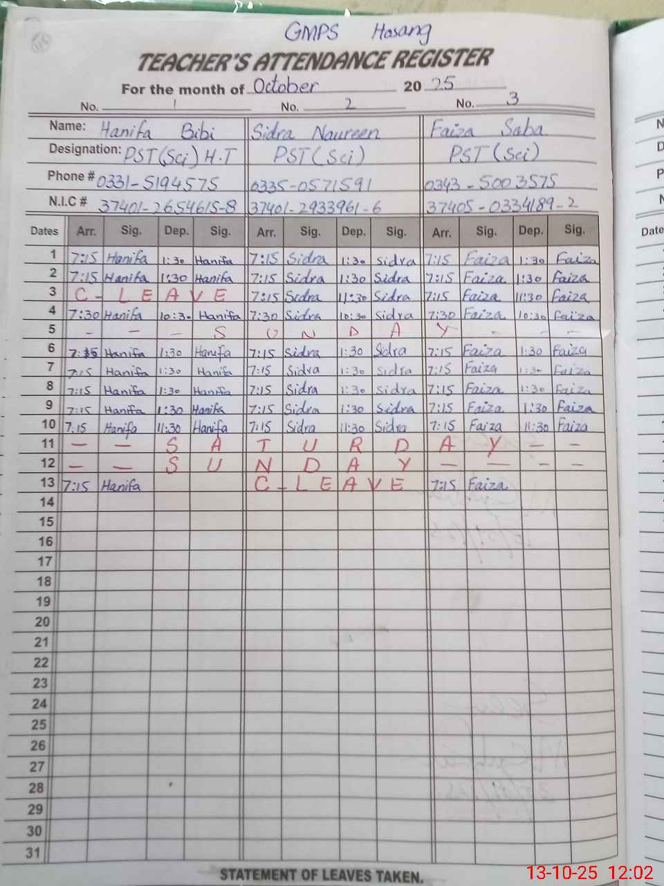 | CNIC | Full Name | Designation | R/C | Absence During Last Calender Month |