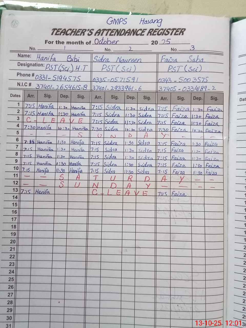 | CNIC | Full Name | Designation | R/C | Absence during last cal. month |