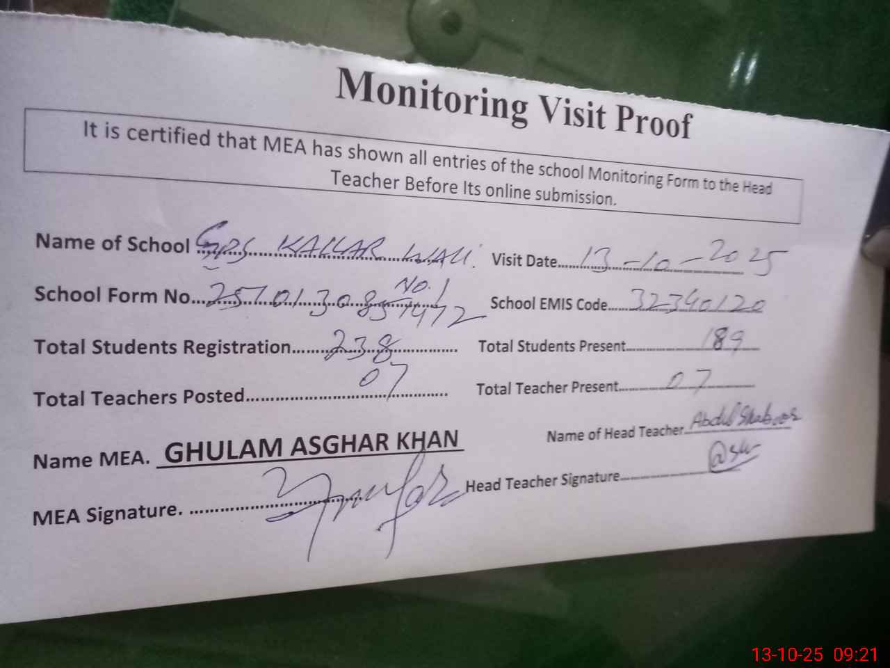 | Attendance Register | Head Teacher | MEA with School | Visit Proof |
