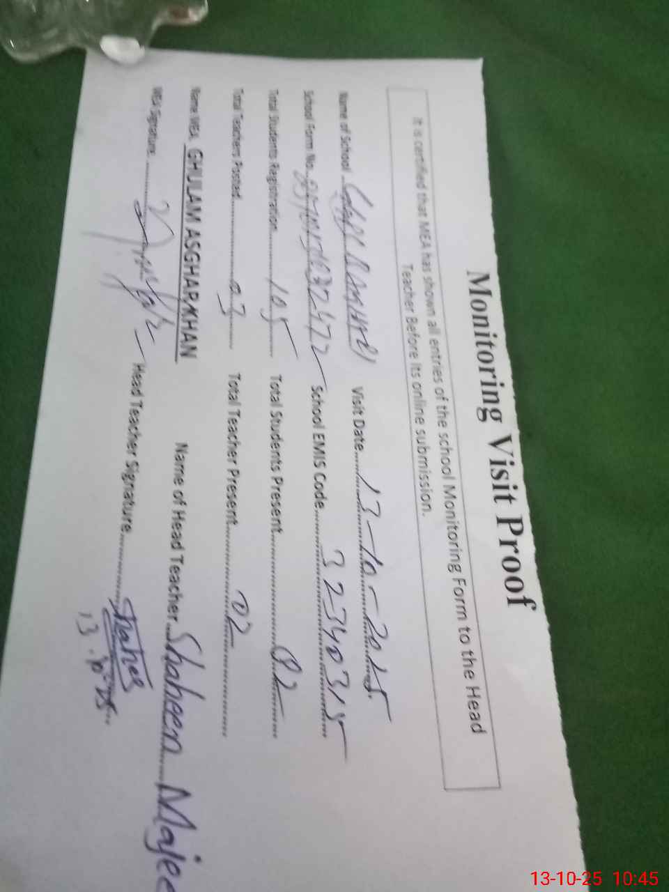 | Attendance Register | Head Teacher | MEA with School | Visit Proof |
