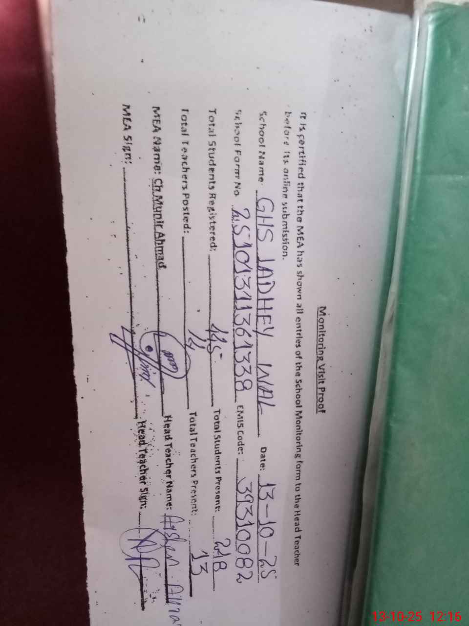 | EMIS Code: 39310082 | Name of School: GHS LADHEY WAL | |||