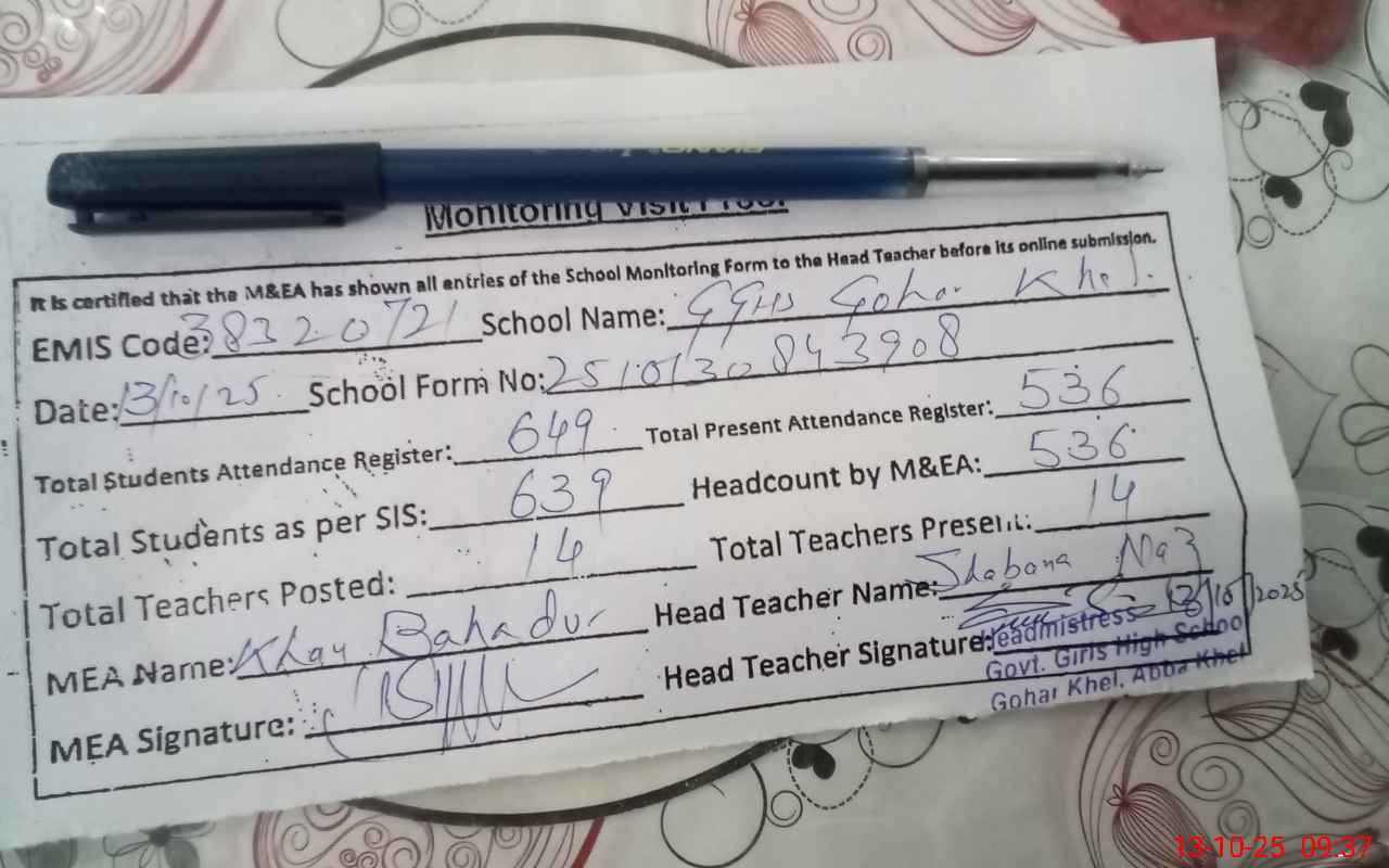 | EMIS Code: 38320721 | Name of School: GGHS GOHAR KHEL ABBA KHEL | |||