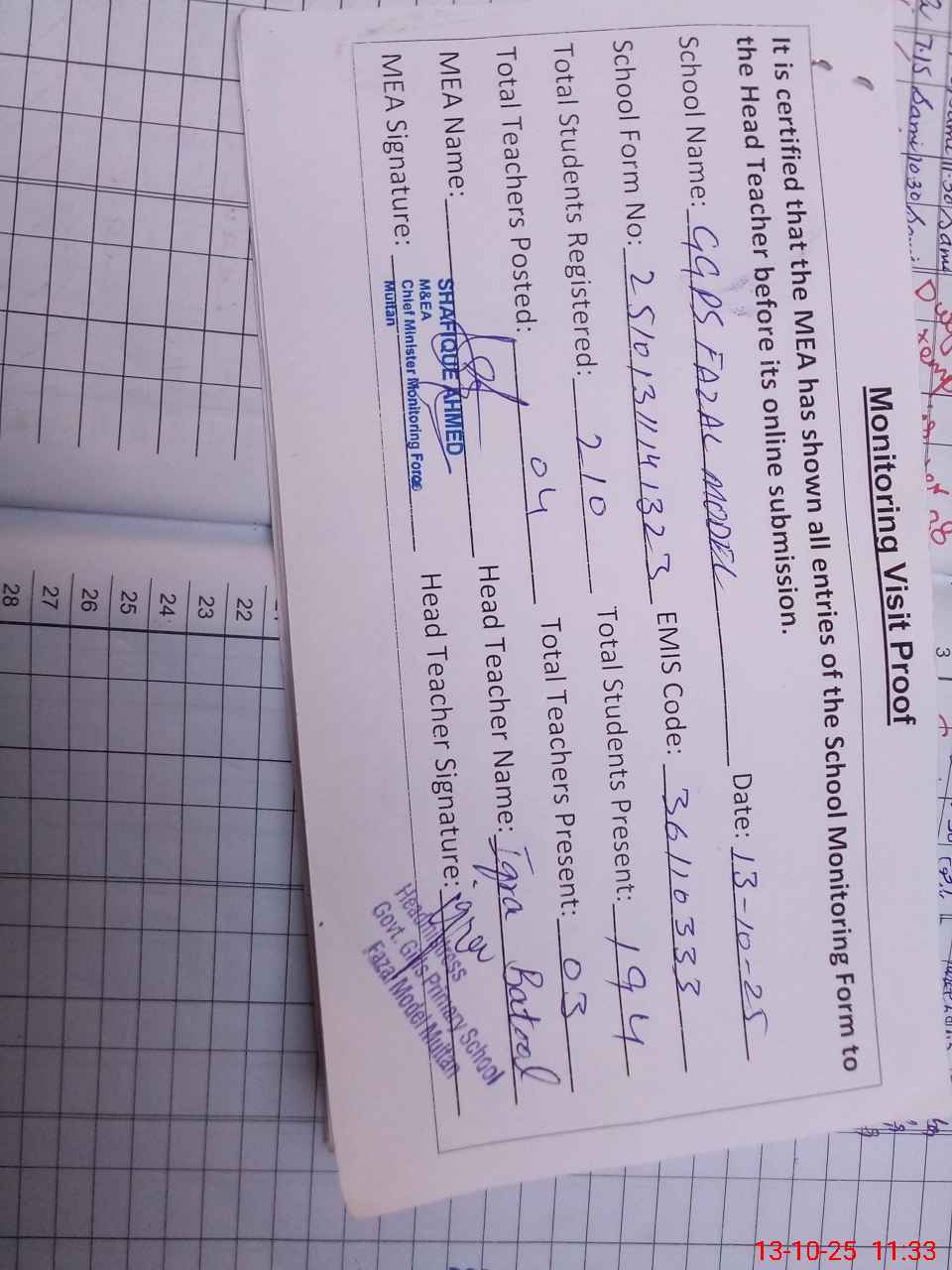 | EMIS Code: 36110333 | Name of School: GGPS FAZAL MODEL BAHAWAL PUR ROAD MULTAN | |||