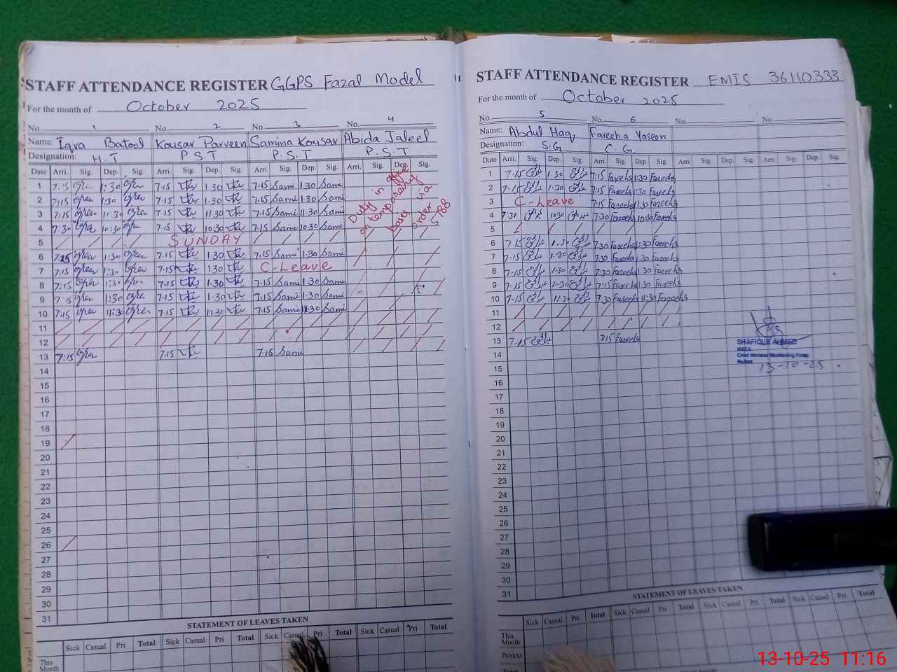 | Leave | Duty | Absent | Maternity | Medical | Ex- Pak |