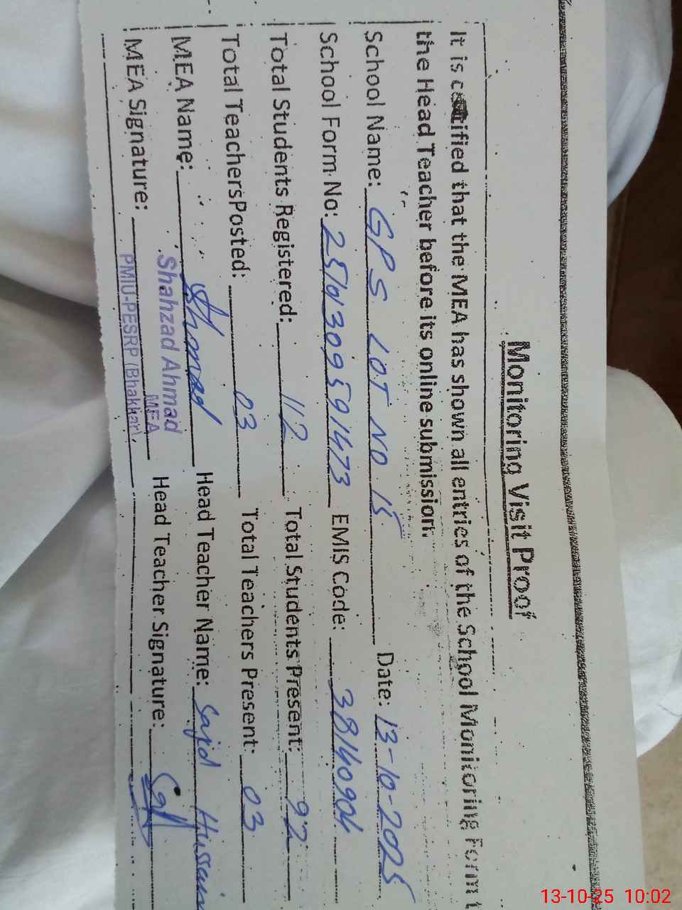 | Attendance Register | Head Teacher | MEA with School | Visit Proof |