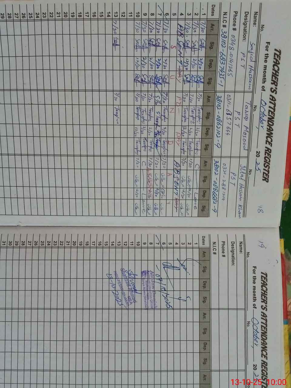| CNIC | Full Name | Designation | R/C | Absence during last cal. month |