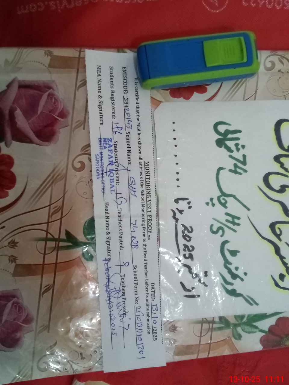 | Certified that this School was Inspected by the Undersigned MEA/DMO Today and the Information Stated Above is as Per Record. | |||||
