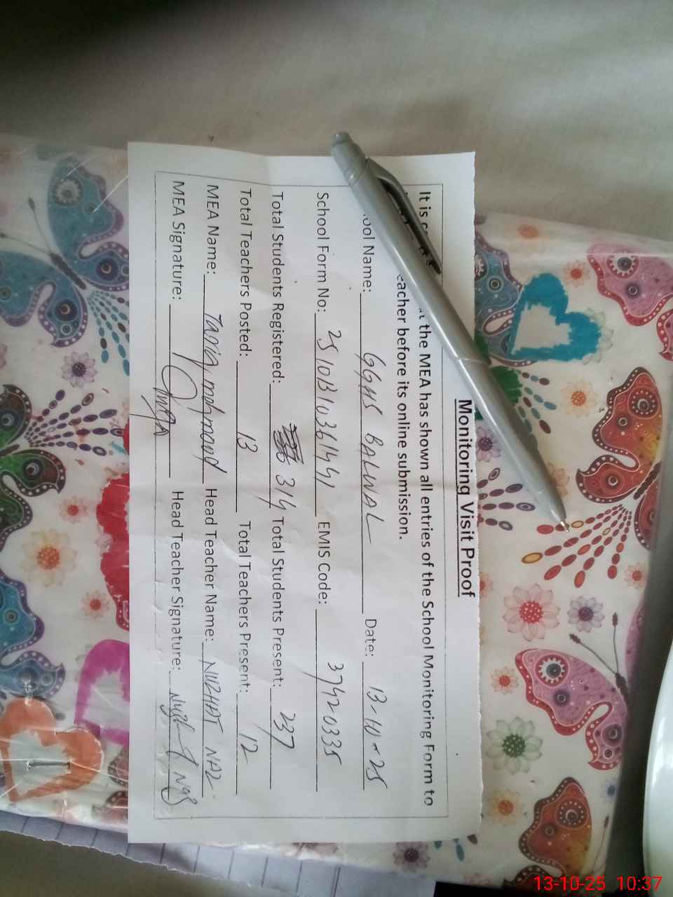 | Attendance Register | Head Teacher | MEA with School | Visit Proof |