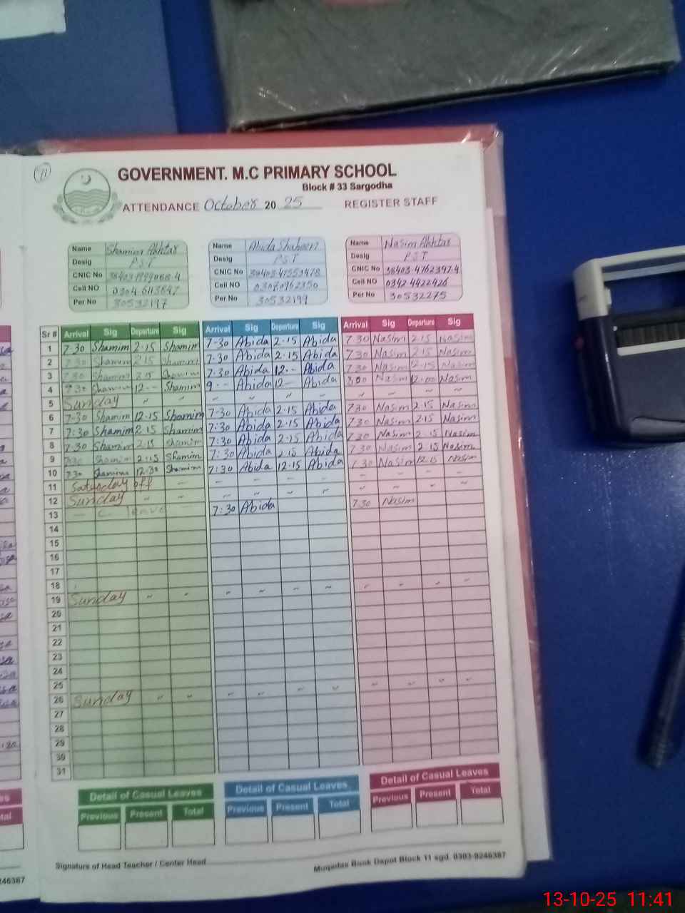 | CNIC | Full Name | Designation | R/C | Absence During Last Calender Month |