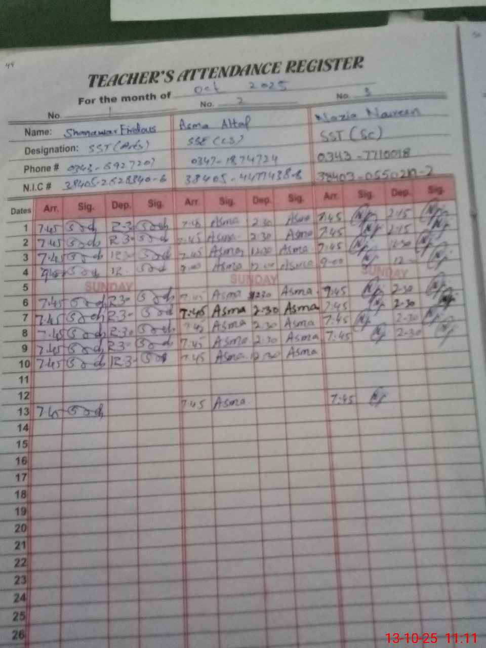 | Name: Sh**** Fi**** Designation: (School Headmaster's/Headmistress's) SST Arts Phone/Cell Number: 03**** |