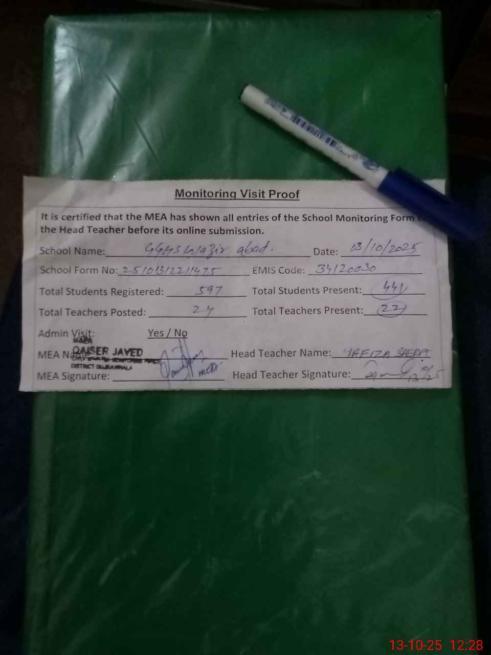 | Remarks (Use Separate Page if Required): Attendence of teachers and students are not up date on sis more over Nadia younas applied leave and awaiting for approvel | |||||
