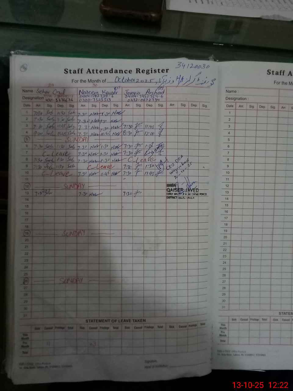 | CNIC | Full Name | Designation | R/C | Absence during last cal. month |