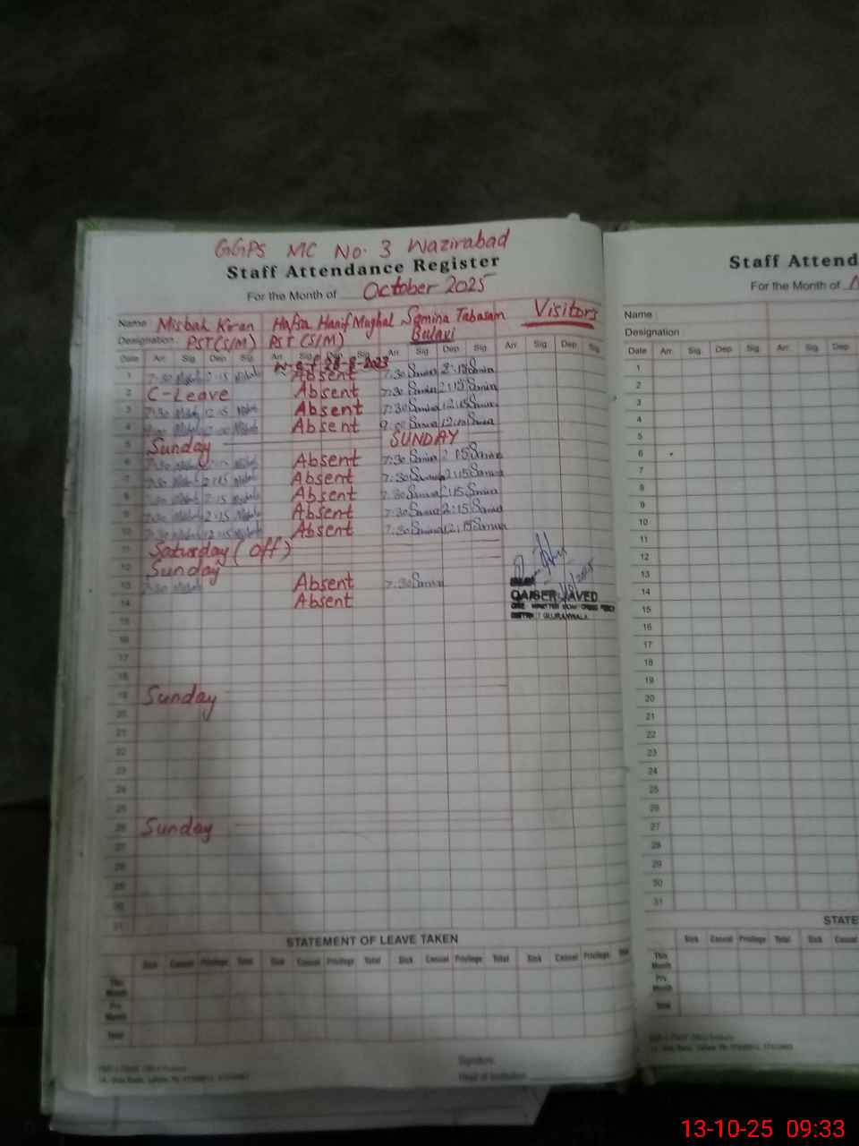 | Remarks (Use Separate Page if Required): Attendence of teachers and students are not up date on sis more over PST Teacher Hafsa hanif Mughal is absent w e f 28 Aug 2023 | |||||