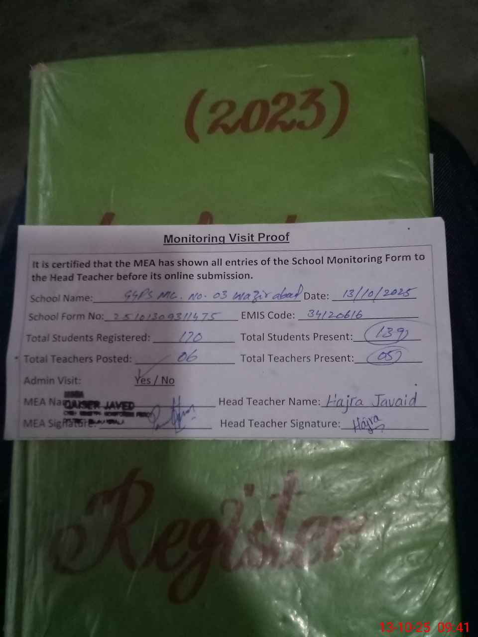 | Attendance Register | Head Teacher | MEA with School | Visit Proof |