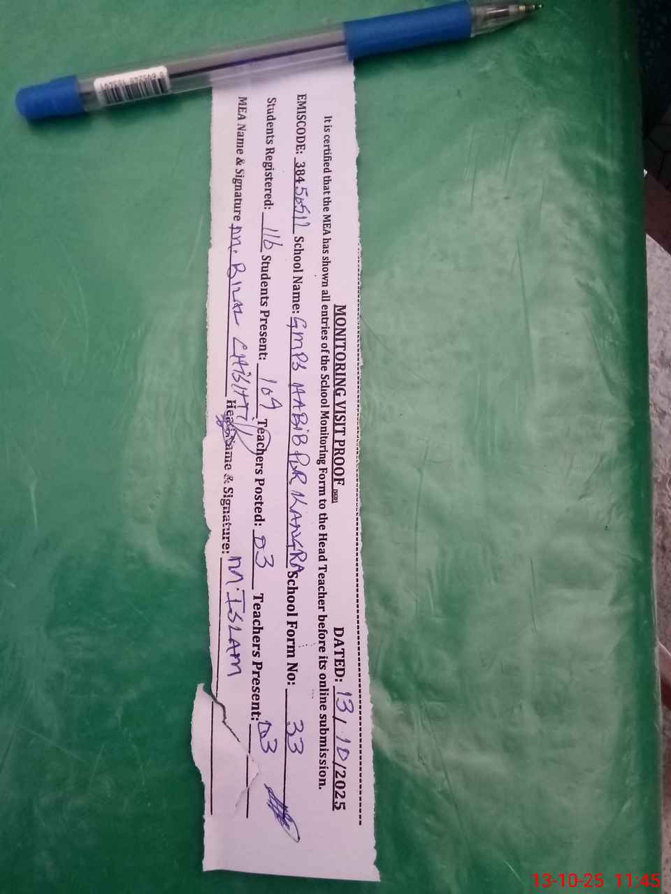 | Attendance Register | Head Teacher | MEA with School | Visit Proof |