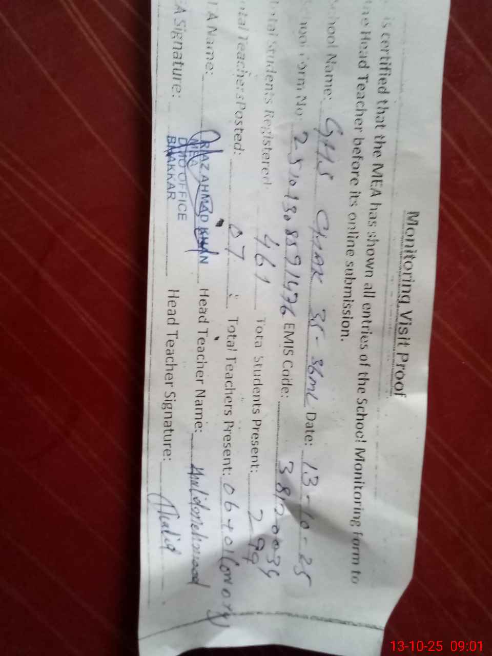 | Certified that this School was Inspected by the Undersigned MEA/DMO Today and the Information Stated Above is as Per Record. | |||||