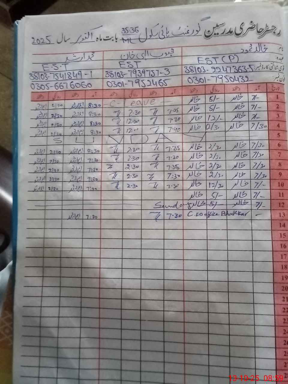 | Name: Kh**** Me**** Designation: (School Headmaster's/Headmistress's) EST Phone/Cell Number: 03**** |