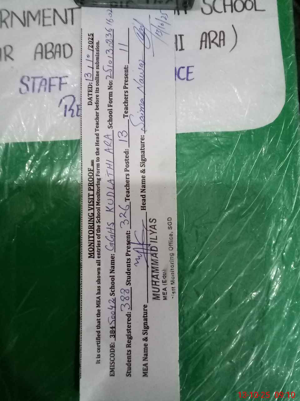| Certified that this School was Inspected by the Undersigned MEA/DMO Today and the Information Stated Above is as Per Record. | |||||