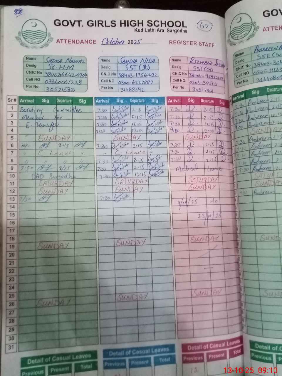 | CNIC | Full Name | Designation | R/C | Absence During Last Calender Month |