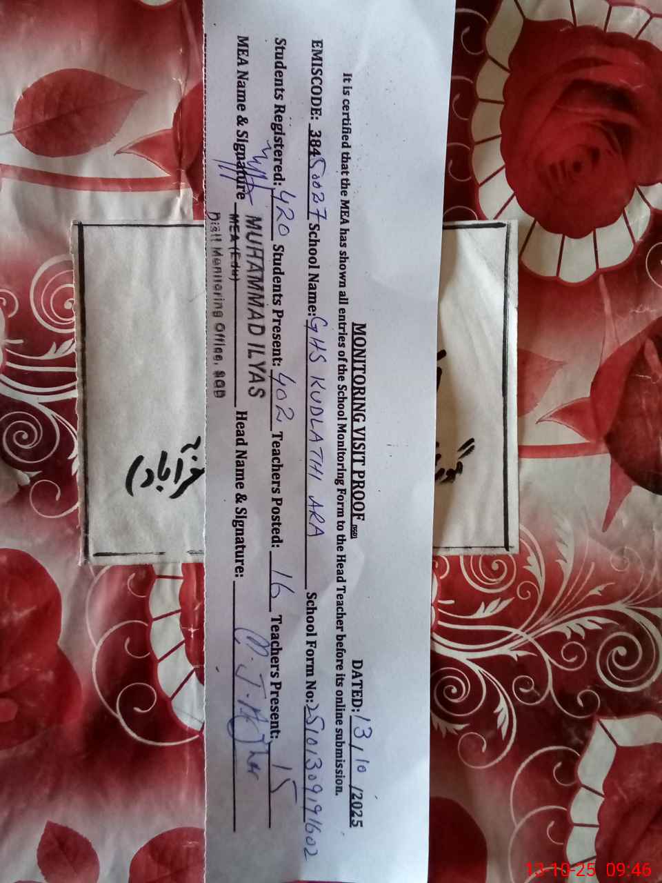 | Certified that this School was Inspected by the Undersigned MEA/DMO Today and the Information Stated Above is as Per Record. | |||||