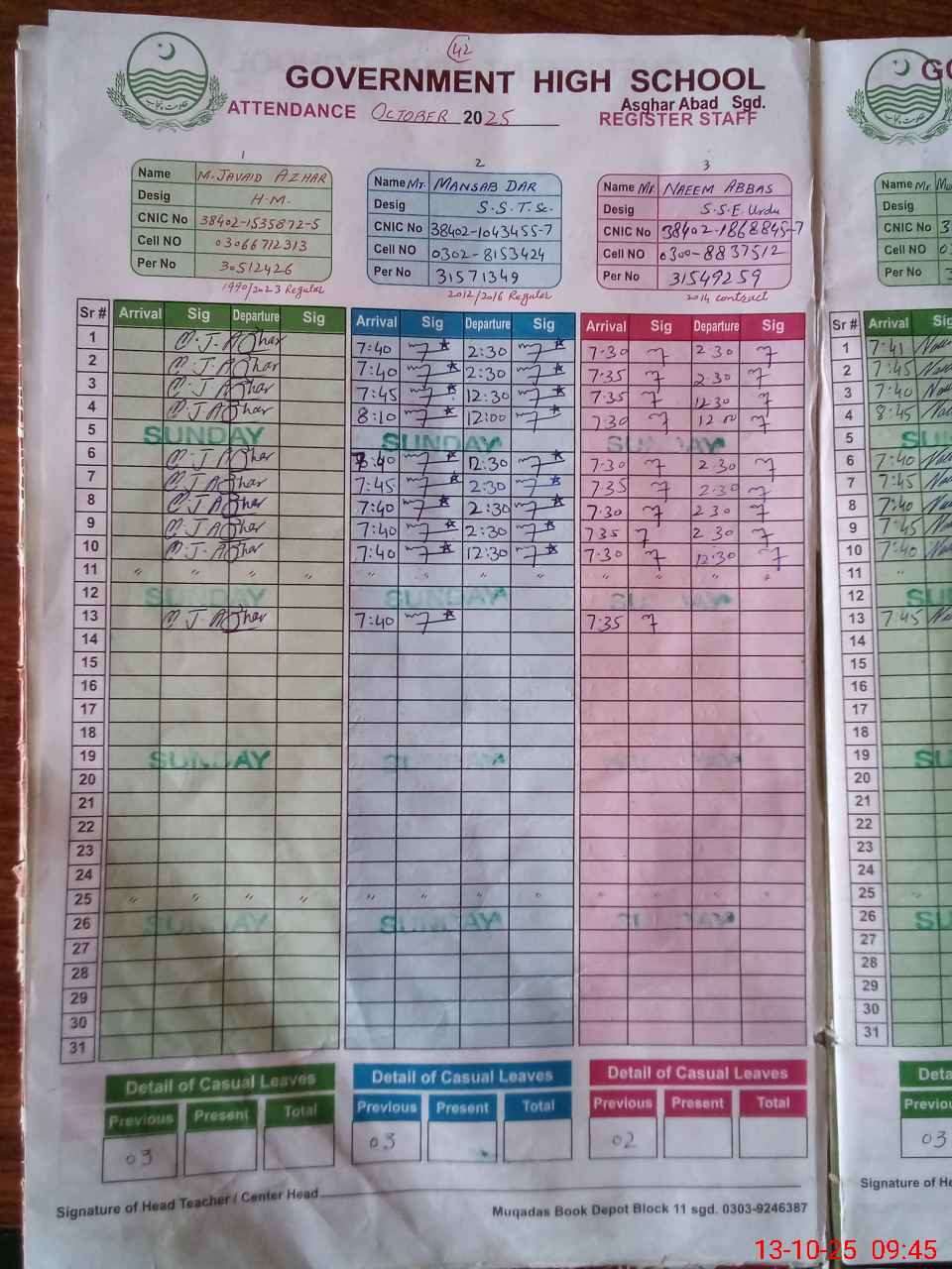 | CNIC | Full Name | Designation | R/C | Absence during last cal. month |