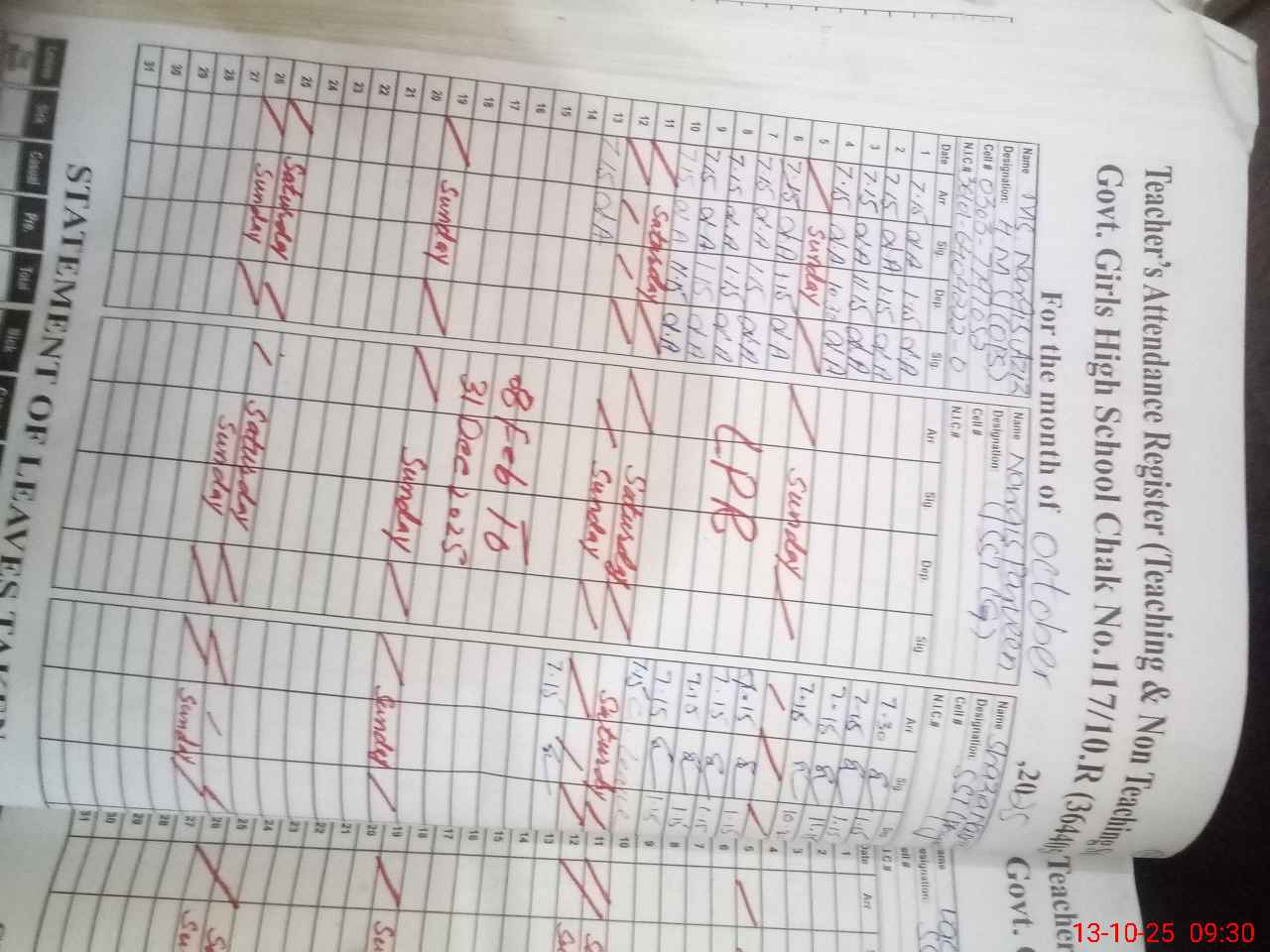 | CNIC | Full Name | Designation | R/C | Absence During Last Calender Month |