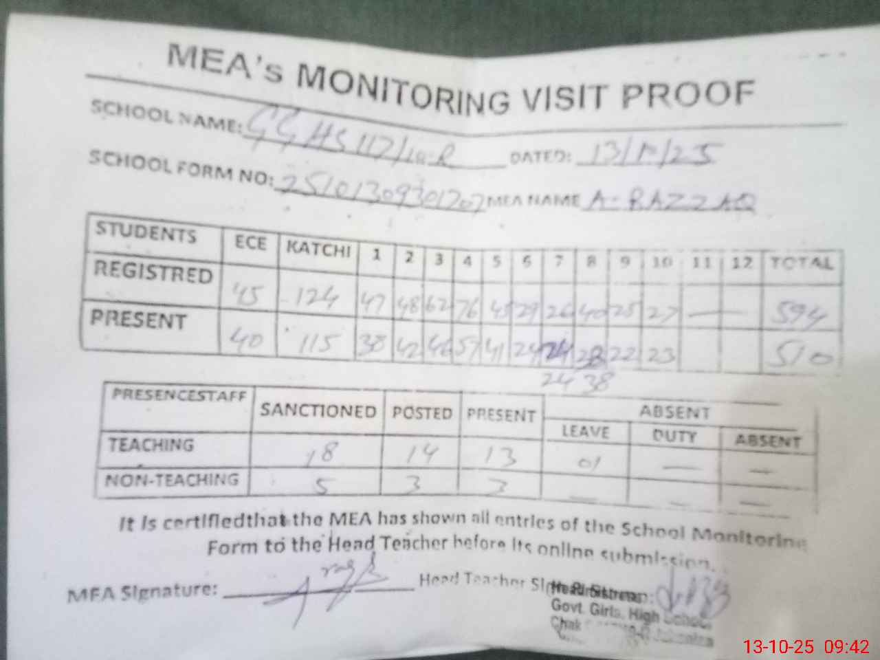 | Attendance Register | Head Teacher | MEA with School | Visit Proof |