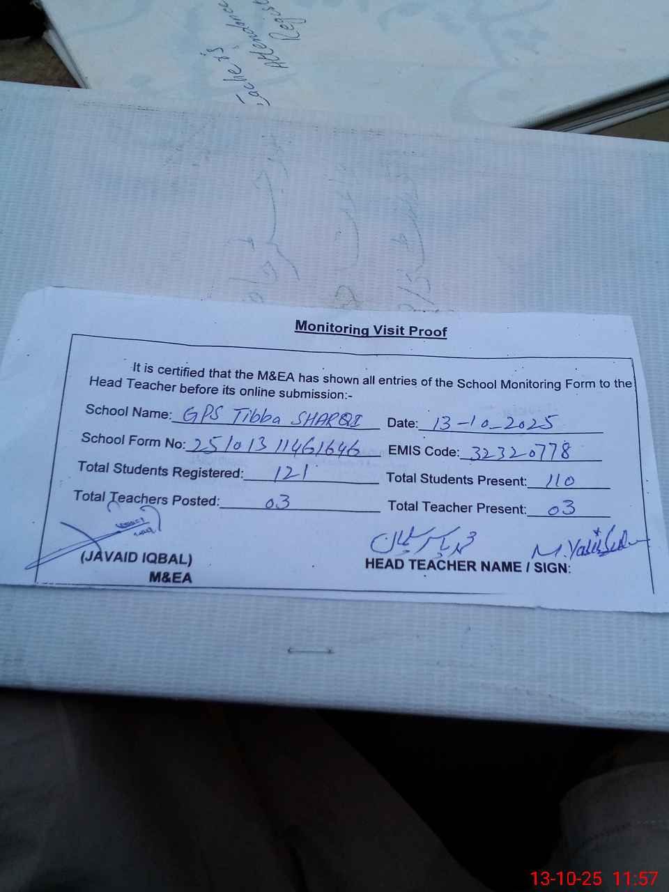 | Attendance Register | Head Teacher | MEA with School | Visit Proof |