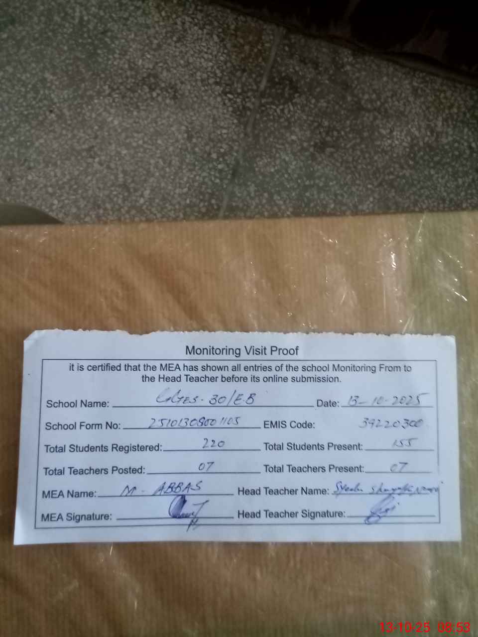 | Certified that this School was Inspected by the Undersigned MEA/DMO Today and the Information Stated Above is as Per Record. | |||||