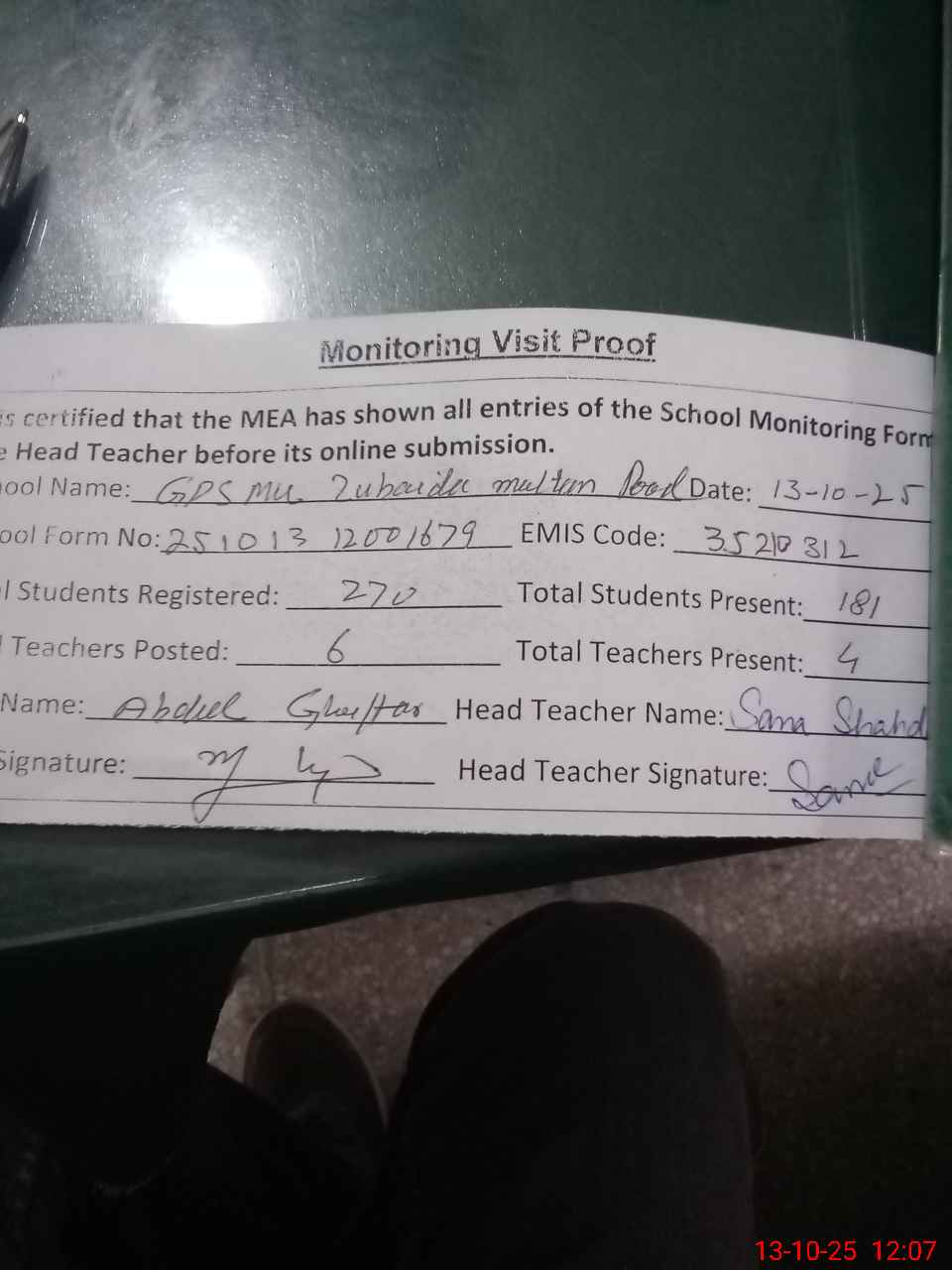| EMIS Code: 35210312 | Name of School: GPS MU ZUBAIDA MULTAN ROAD BAIT UR RAZA COLONY | |||