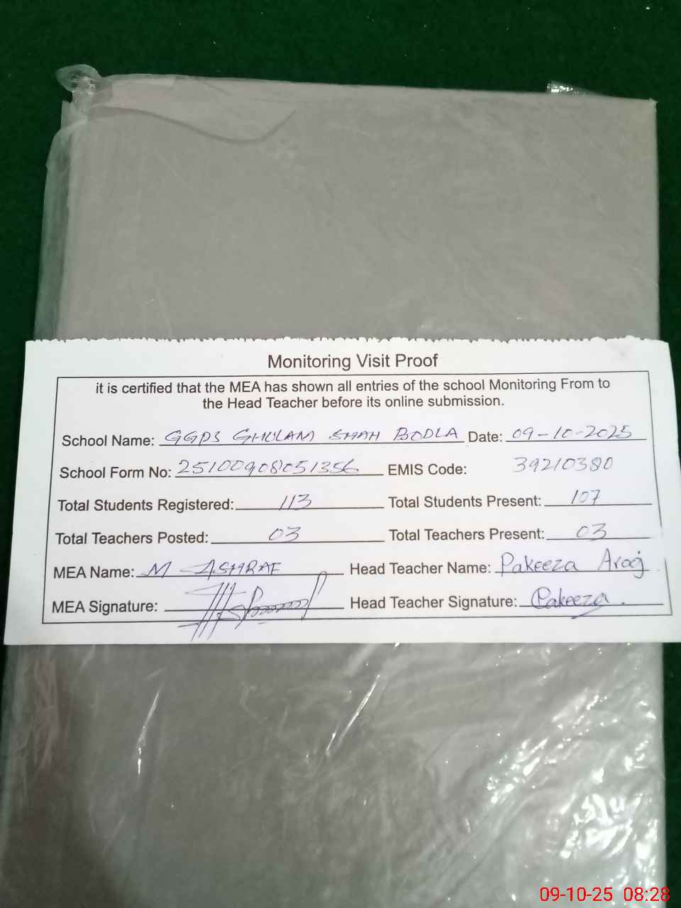 | Attendance Register | Head Teacher | MEA with School | Visit Proof |