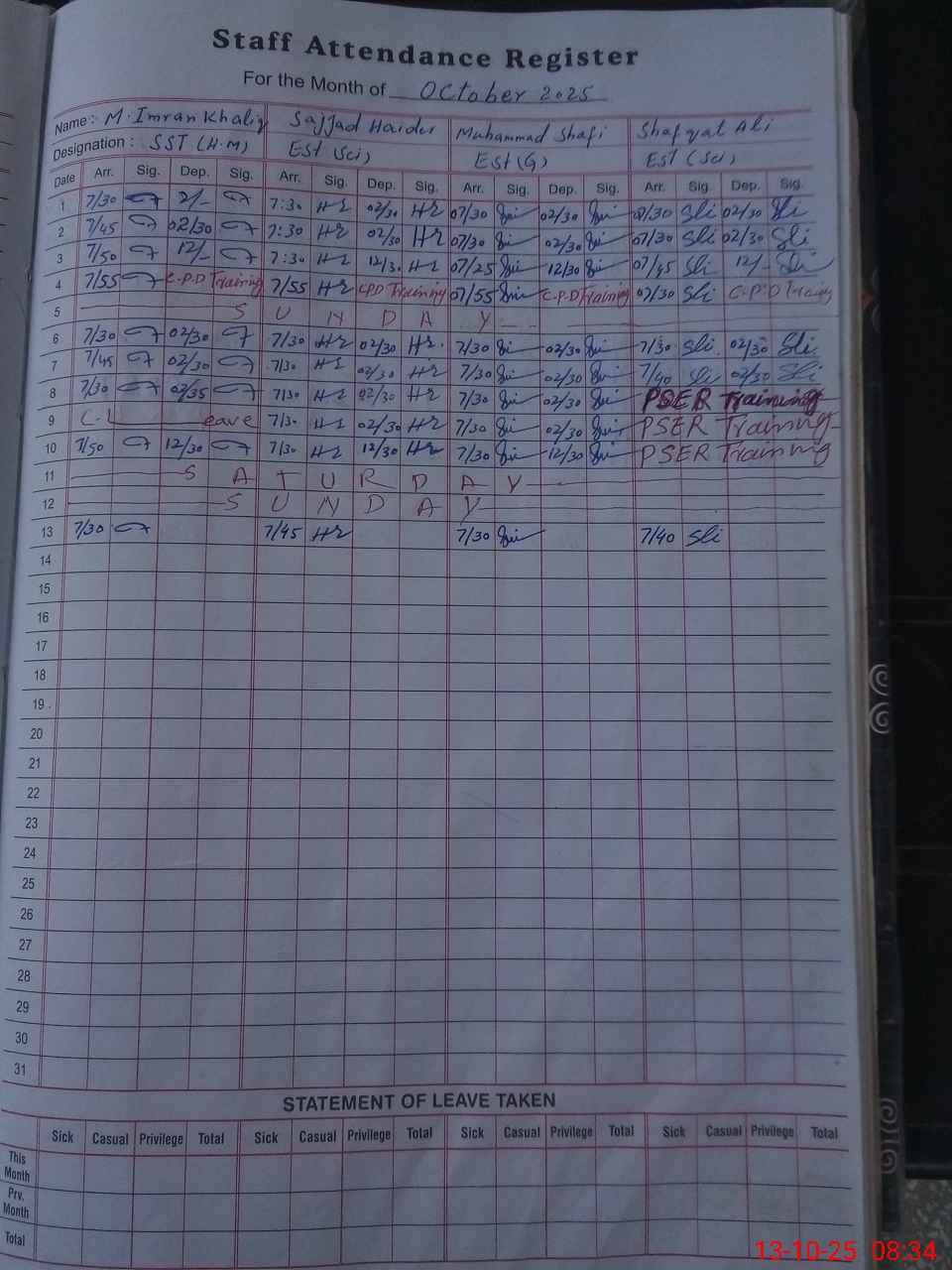 | CNIC | Full Name | Designation | R/C | Absence During Last Calender Month |
