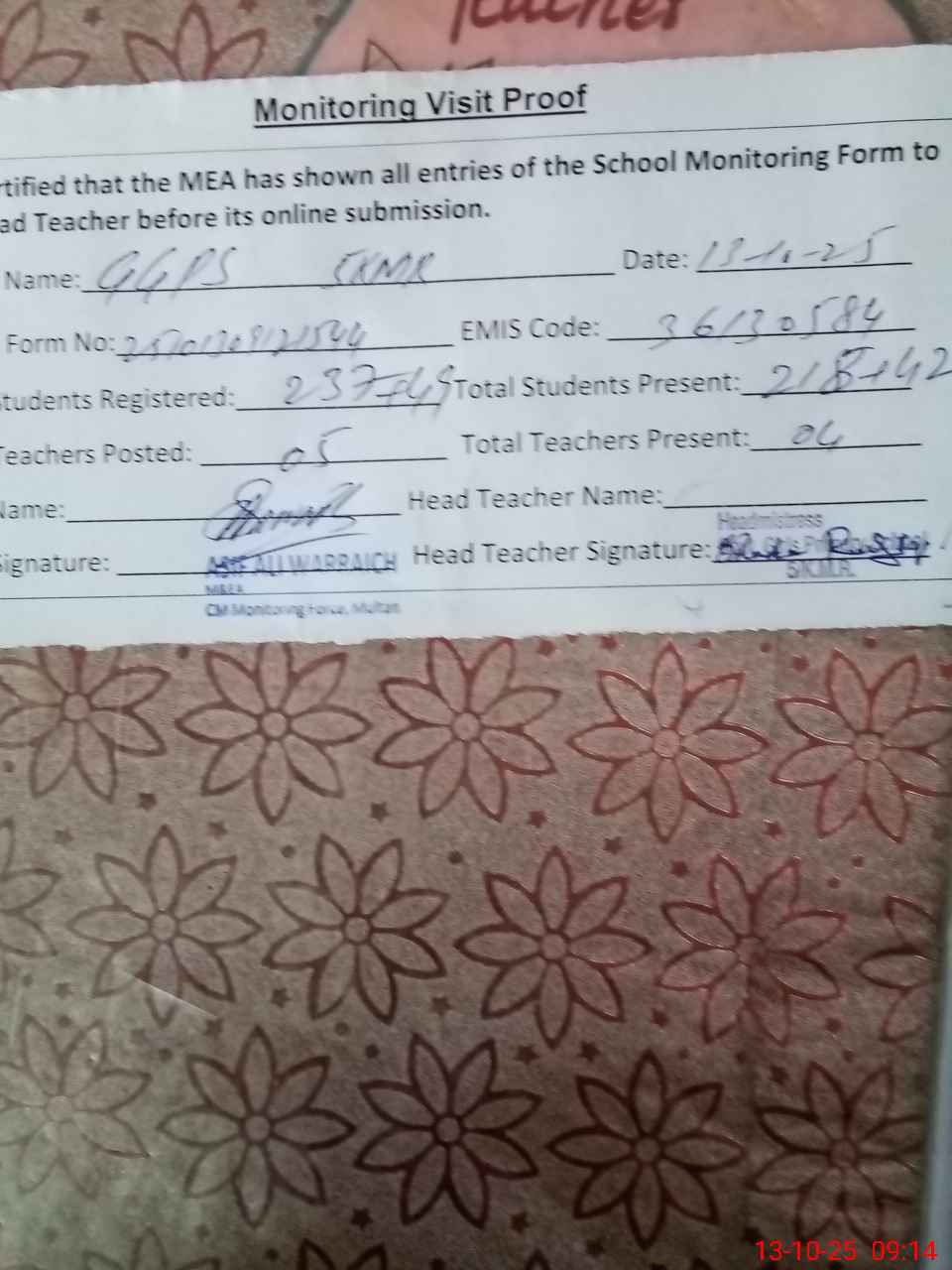 | Attendance Register | Head Teacher | MEA with School | Visit Proof |