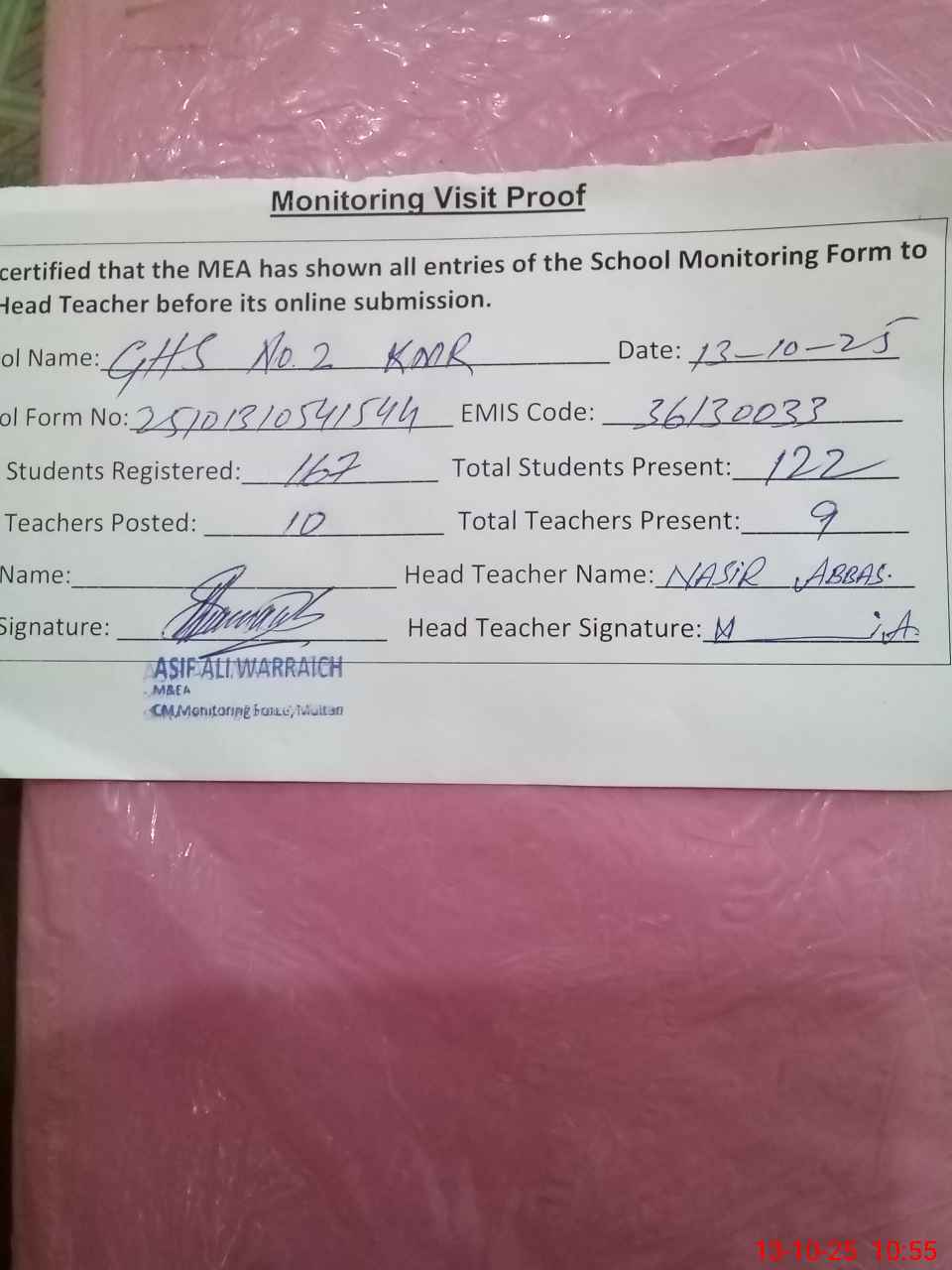 | Certified that this School was Inspected by the Undersigned MEA/DMO Today and the Information Stated Above is as Per Record. | |||||