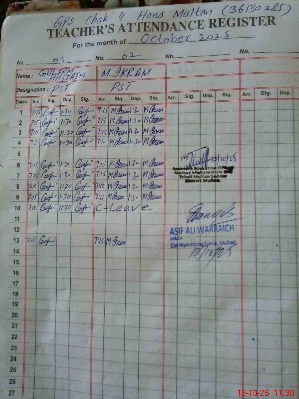 | CNIC | Full Name | Designation | R/C | Absence During Last Calender Month |
