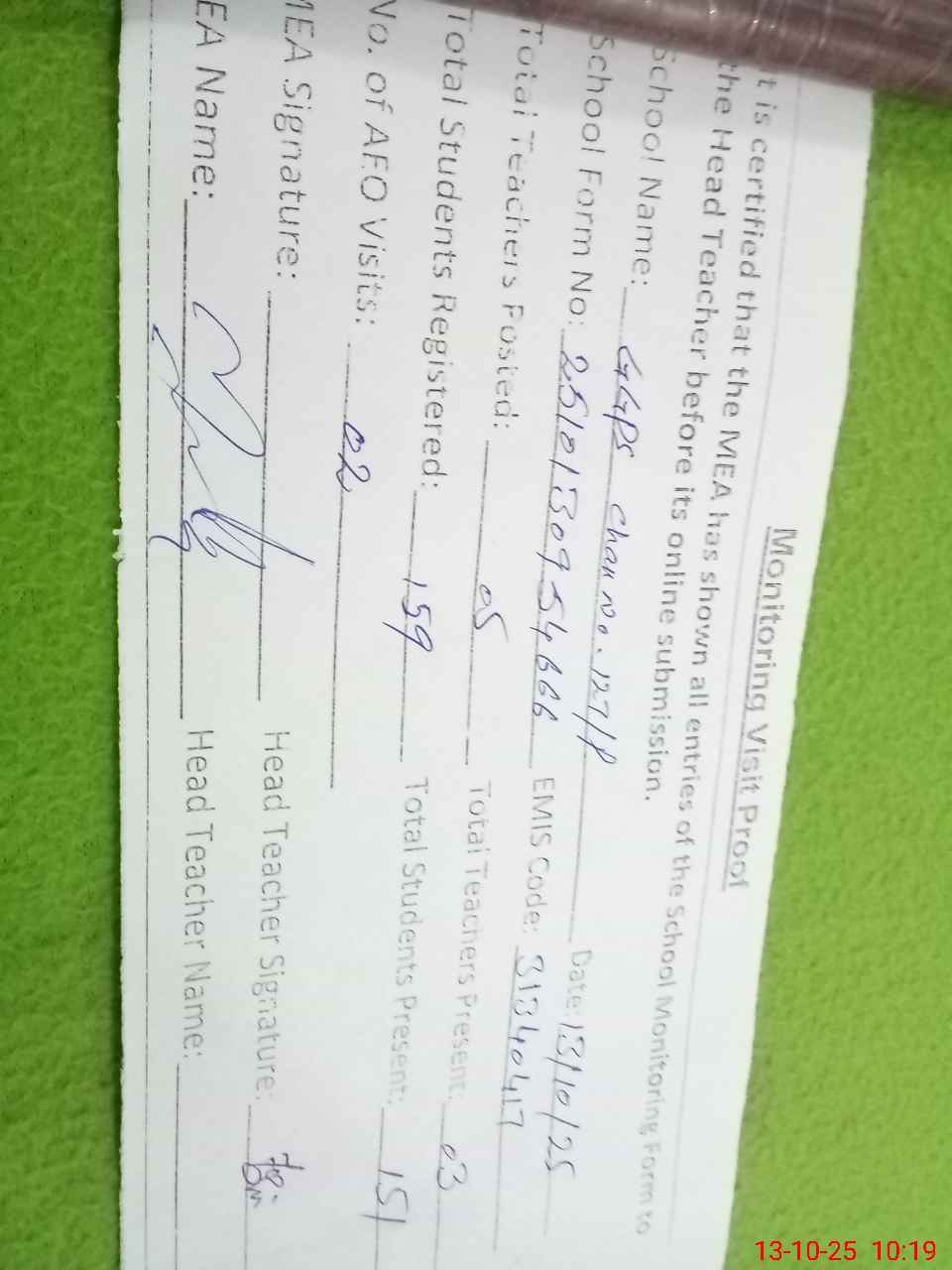 | Attendance Register | Head Teacher | MEA with School | Visit Proof |