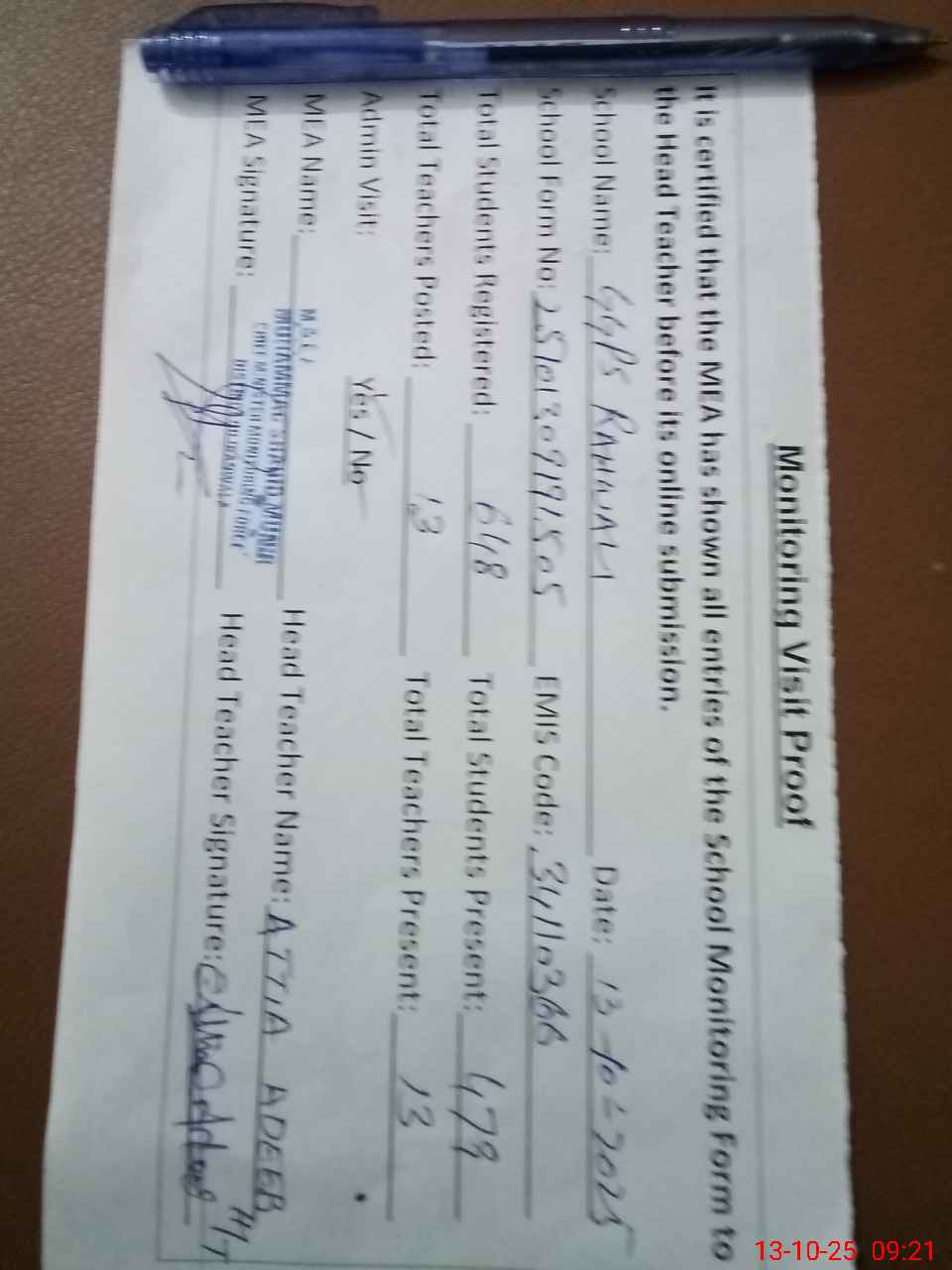 | Attendance Register | Head Teacher | MEA with School | Visit Proof |