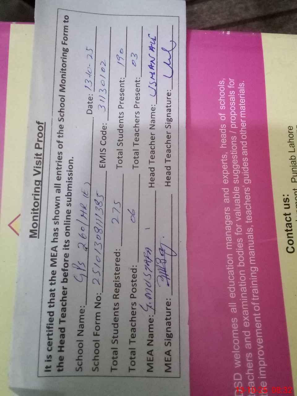 | Certified that this School was Inspected by the Undersigned MEA/DMO Today and the Information Stated Above is as Per Record. | |||||