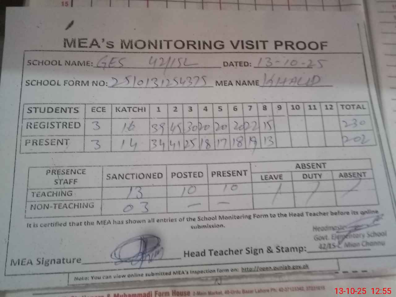 | Attendance Register | Head Teacher | MEA with School | Visit Proof |