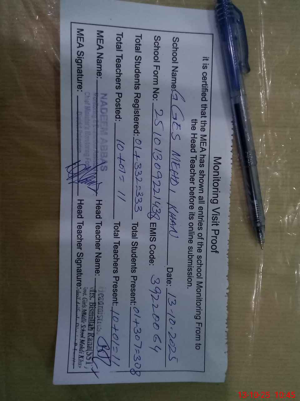 | Certified that this School was Inspected by the Undersigned MEA/DMO Today and the Information Stated Above is as Per Record. | |||||