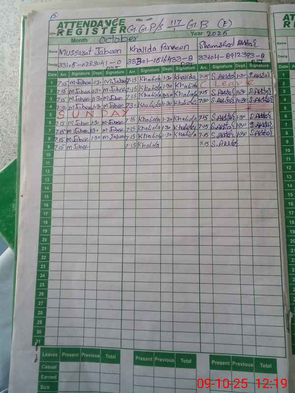 | CNIC | Full Name | Designation | R/C | Absence During Last Calender Month |