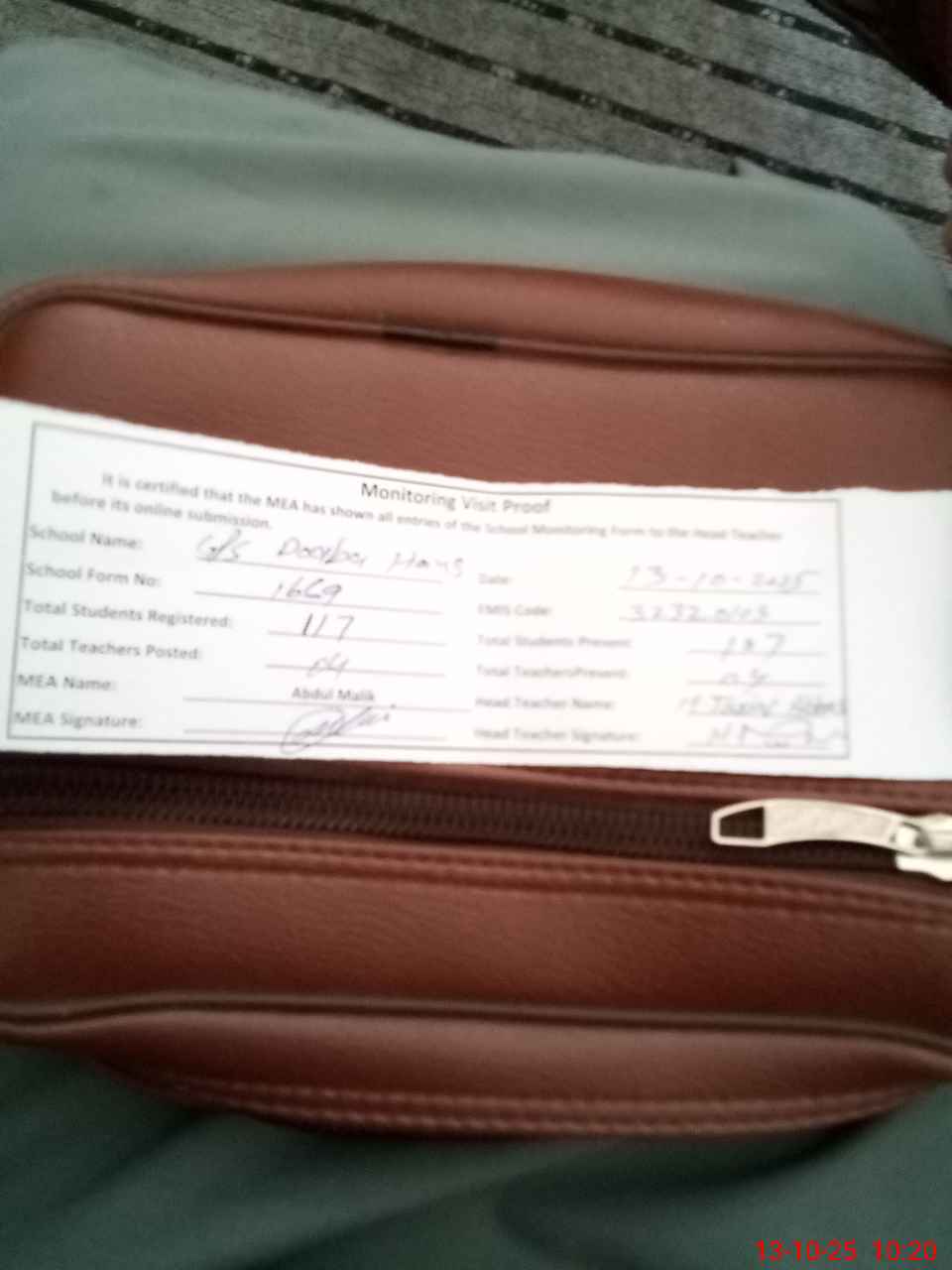 | Attendance Register | Head Teacher | MEA with School | Visit Proof |