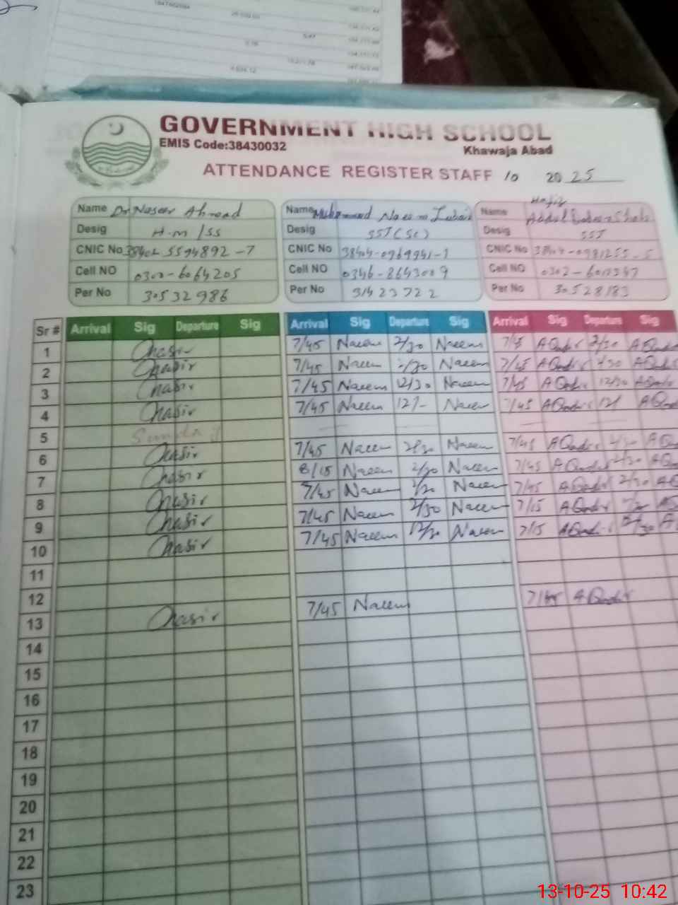 | CNIC | Full Name | Designation | R/C | Absence during last cal. month |
