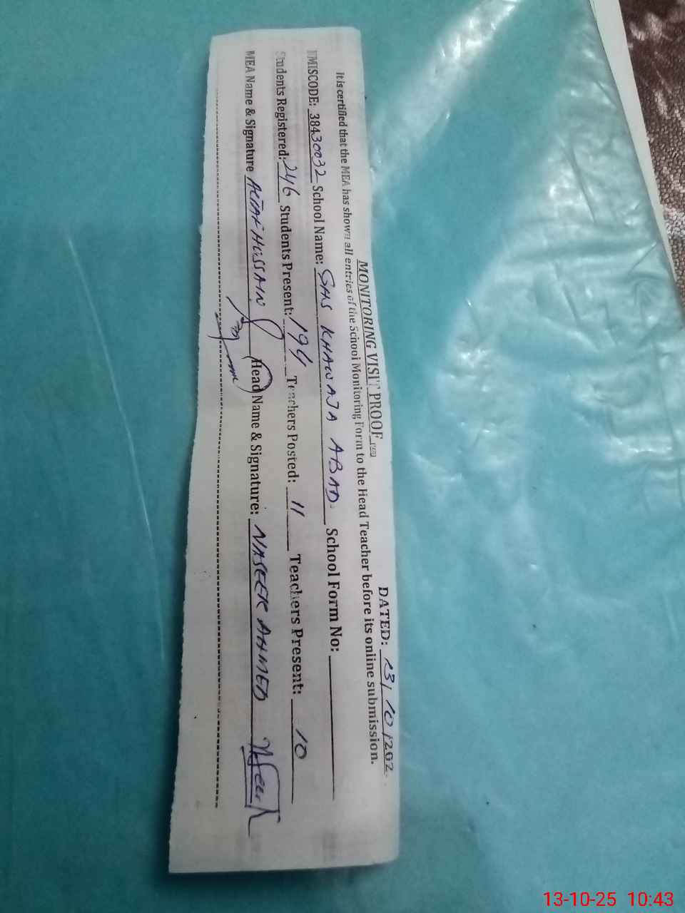 | Certified that this School was Inspected by the Undersigned MEA/DMO Today and the Information Stated Above is as Per Record. | |||||