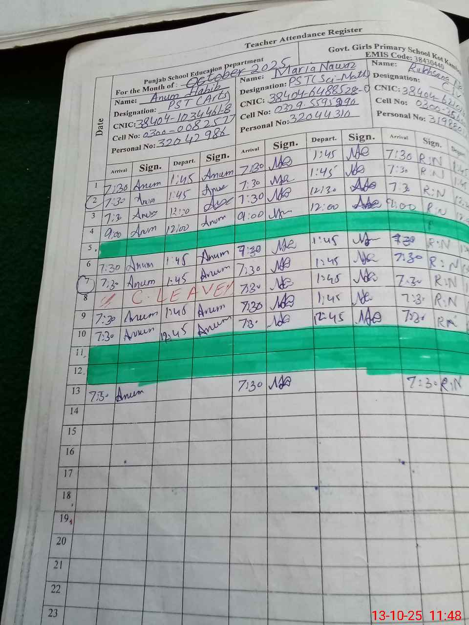 | CNIC | Full Name | Designation | R/C | Absence during last cal. month |
