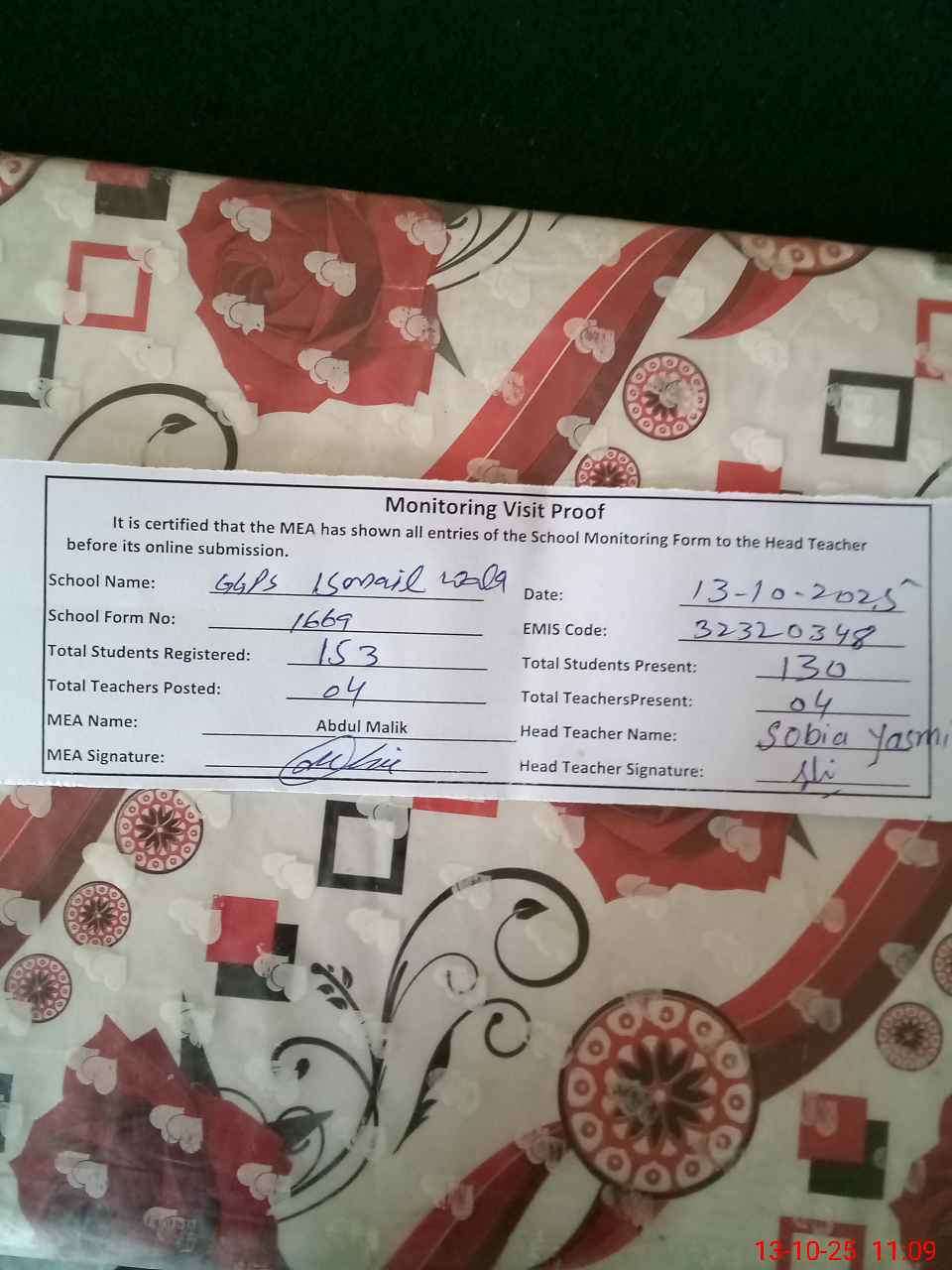 | Certified that this School was Inspected by the Undersigned MEA/DMO Today and the Information Stated Above is as Per Record. | |||||