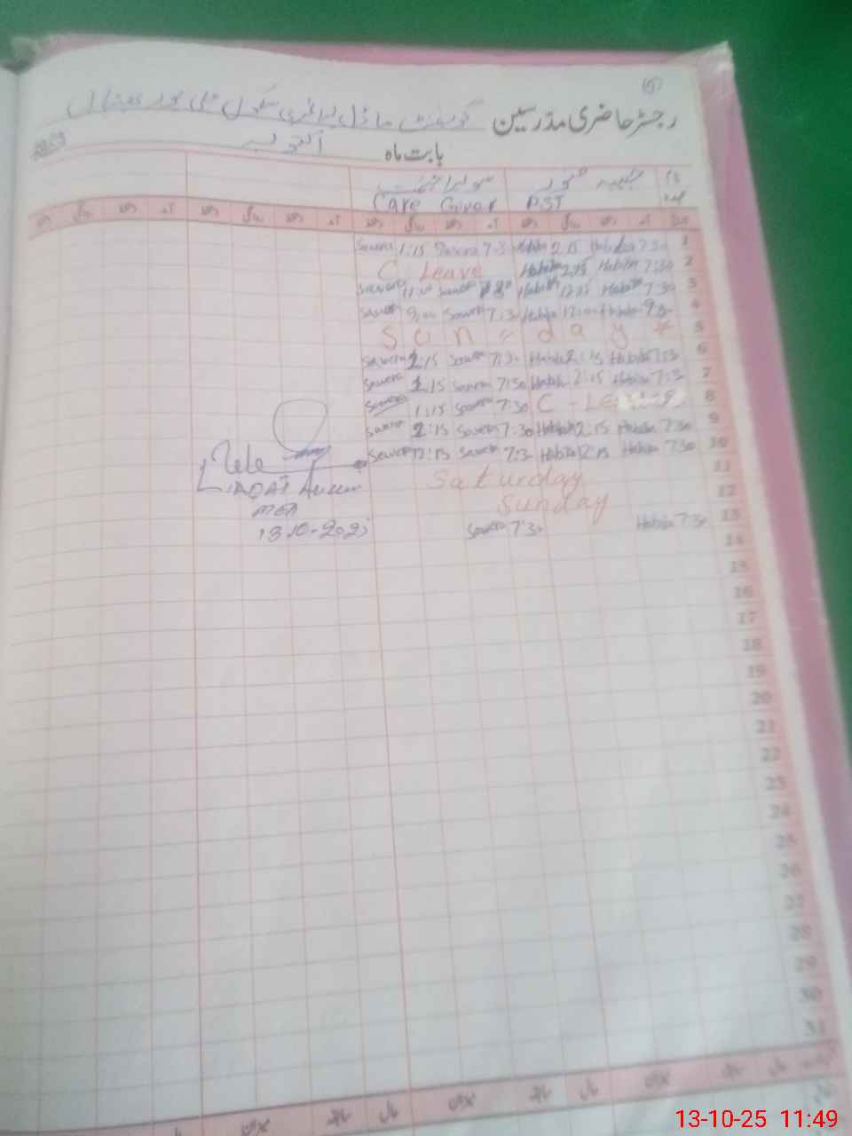 | CNIC | Full Name | Designation | R/C | Absence During Last Calender Month |