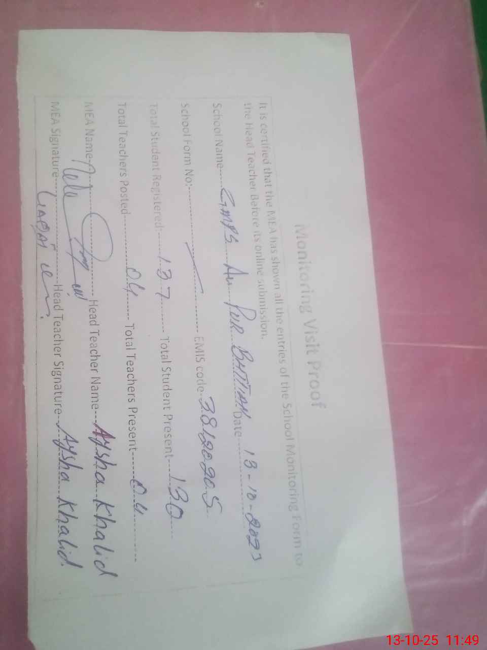 | Attendance Register | Head Teacher | MEA with School | Visit Proof |